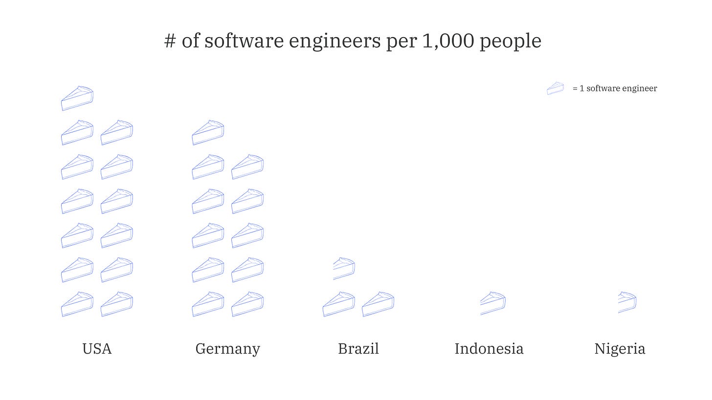 The US has roughly 12.9 software engineers per 1,000 people. Western Europe averages a similar range: the UK sits at 13.2, Germany at 10.8. Now compare that to the fastest-growing emerging markets. Indonesia has 0.71. Nigeria has 0.48. Brazil, the largest economy in Latin America, has 2.3. The talent pool in these markets is a fraction of what founders in San Francisco, London, or Berlin take for granted.